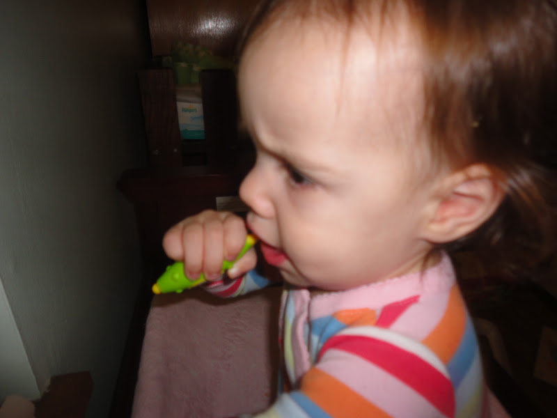 1. She was a fussy monster for a couple of hours after I picked her up from day care. Her mini-tantrums right now are so funny, ridiculous, infuriating... and did I mention funny? She gets frustrated- usually because she's trying to communicate something that we're not getting, and she lashes out. She'll whack me or scratch me, and then she'll stop and look at me dead serious in the eye, waiting to see what's going to happen. This is hilarious to me, but I don't laugh. I either ignore or ask her to be gentle, and then she rubs my arm, and says "awwwww". Her mini tantrums also include some screeching and crying and throwing herself down on the floor in dramatic fashion. I do not have a picture of this today, but I thought her spicy attitude was worth mentioning.